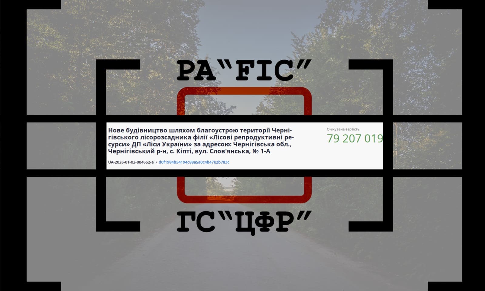 27 січня ДЕРЖАВНЕ СПЕЦІАЛІЗОВАНЕ ГОСПОДАРСЬКЕ ПІДПРИЄМСТВО “ЛІСИ УКРАЇНИ” провело закупівлю на нове будівництво шляхом благоустрою території Чернігівського лісорозсадника філії “Лісові репродуктивні ресурси” ДП “Ліси України” за адресою: Чернігівська обл., Чернігівський р-н, с. Кіпті, вул. Слов’янська, № 1-А.