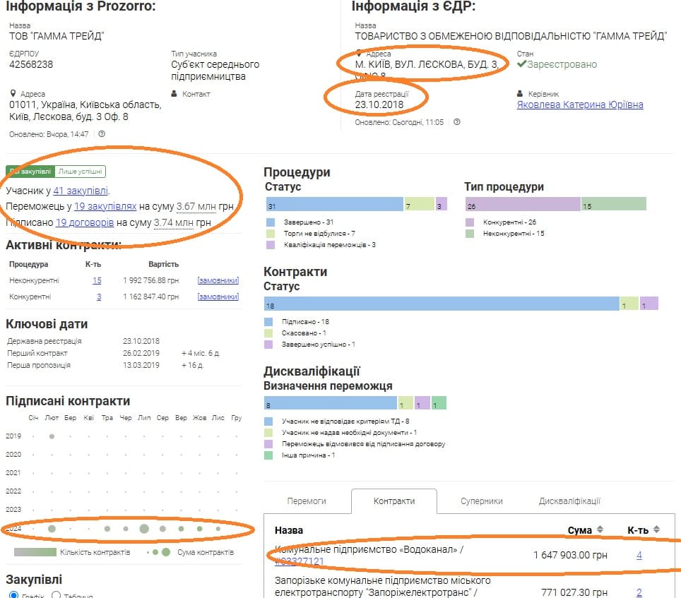 ТОВ знаходиться в Києві. Зареєстрований у 2018 році. Має 19 договорів на 3 мільйони гривень. Цікавим є діяльність підприємства: у 2019 році мав один контракт, а всі інші отримав з лютого по листопад 2024 року. Найбільше взаємодіє з “Водоканалом” міста Запоріжжя: 4 контракти на 1,6 мільйона гривень. Співпрацює з сімома замовниками, майже всі знаходяться в Запорізькій області. Компанія фіксує 55 видів діяльності, має трьох співробітників.