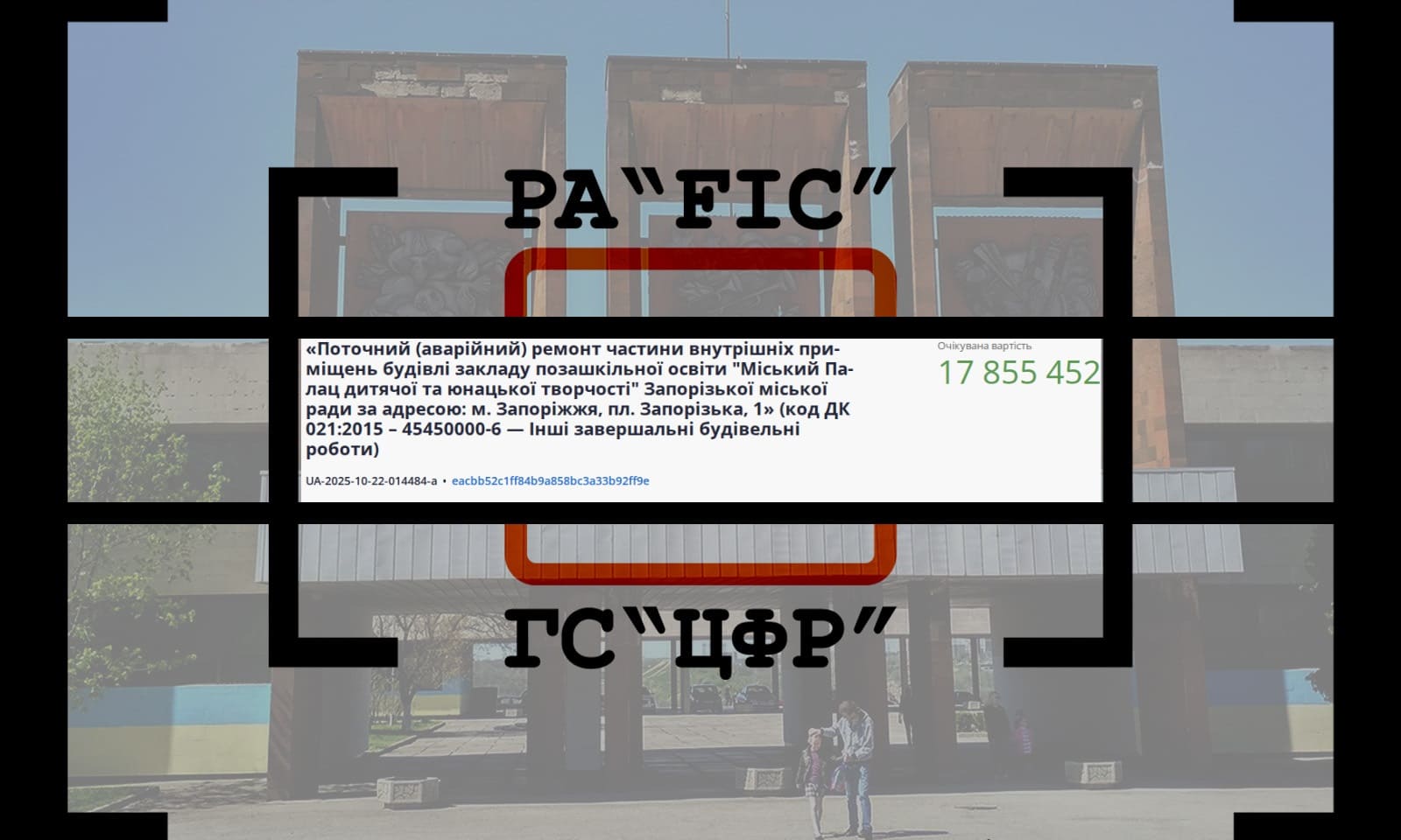 30 жовтня Департамент освіти і науки Запорізької міської ради провів закупівлю на поточний  (аварійний) ремонт частини внутрішніх приміщень будівлі закладу позашкільної освіти “Міський Палац дитячої та юнацької творчості” Запорізької міської ради за адресою: м. Запоріжжя, пл. Запорізька, 1.