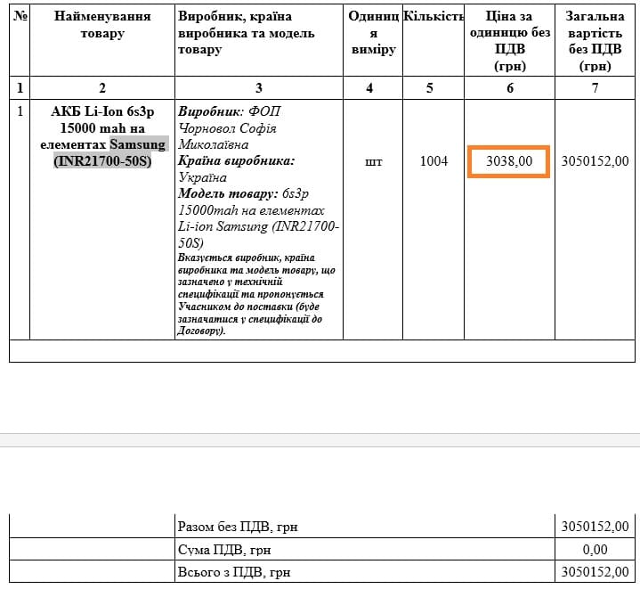 На торгах змагались 8 учасників, попередньо, перемогу здобуває ФОП “ЧОРНОВОЛ СОФІЯ МИКОЛАЇВНА” з пропозицією у 3 050 152 гривні. ФОП пропонує моделі Samsung (INR21700-50S) по 3038 гривень за одиницю.