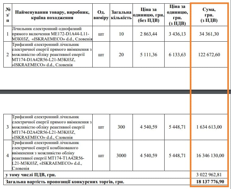 30 січня АКЦІОНЕРНЕ ТОВАРИСТВО “ЖИТОМИРОБЛЕНЕРГО” провів закупівлю на лічильники електричної енергії, очікуваною вартістю 105 285 585 гривень. Закупівля складалась із трьох лотів.