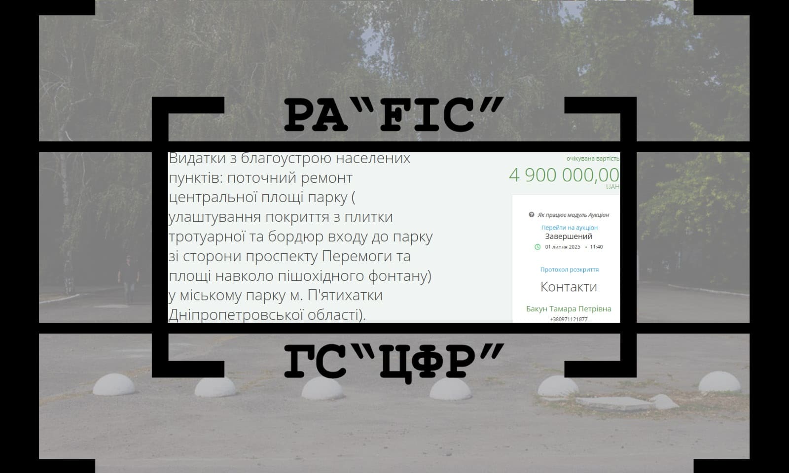 1 липня КП Комунальне підприємство П’ятихатської міської ради “КОМУНАЛЬНИЙ СЕРВІС” провело закупівлю на поточний ремонт центральної площі парку ( улаштування покриття з плитки тротуарної та бордюр входу до парку зі сторони проспекту Перемоги та площі навколо пішохідного фонтану) у міському парку м. П’ятихатки Дніпропетровської області).